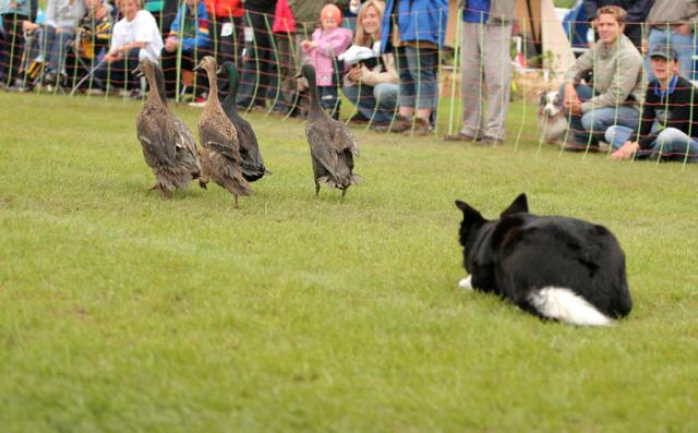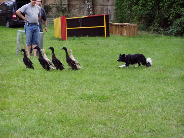 Unsere Border-Collie Hündin Lynn hütet Laufenten, welche wir eigens neben Schafen zu diesem Training auf unserm Betriebsgelände halten.